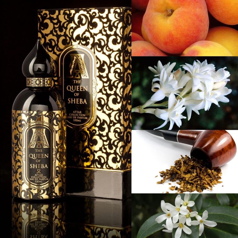 Верхние ноты The Queen of Sheba привлекают сочетанием нежного персика с жасмином, османтусом, ладаном и табачным листом. На этом фоне отчетливо выделяется аккорд спелого абрикоса. Ноты сердца парфюмерной воды представлены туберозой, цитрусами и красной розой. Они обеспечивают композиции свежее и яркое звучание, без излишней сладости. Базовые ноты включают белый мускус, кедр, амбру, ветивер. Это традиционный выбор для восточных ароматов парфюмерного дома Attar Collection, который делает их узнаваемыми.
