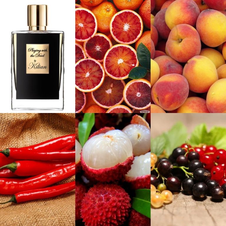 Kilian Playing With the Devil – это композиция из нот красного апельсина, черной смородины, персика и личи, розы, красного перца, жасмина, белого кедра, сандалового дерева, пачули и бобов тонка, бензоина и ванили.