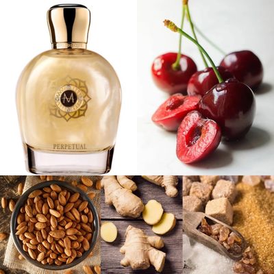 Perpetual - это фруктово-гурманский аромат, украшенный сливочно-миндальными и молочно-древесными нотками. В начале вас встречает вишня, смешанная с миндалём, а также яркий, цитрусово-пряный аккорд, задающий энергичный ритм композиции. Имбирь и сладкий апельсин служат увертюрой к цветочному букету. из розы и жасмина. А завершает образ роскошная, тёплая база из нежного и чувственного мускуса, гармонично сочетающегося с ванилью, сандалом и лёгким оттенком коричневого сахара.