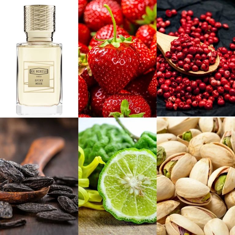 Аромат Spiky Muse раскрывается нотами клубники, дополненными нюансами свежего бергамота и пряными акцентами розового перца. В сердце абсолют розы соединяется с оттенками фисташки, которым на смену приходят ноты кедра, бобов тонка, акигалавуда и амброфикса.