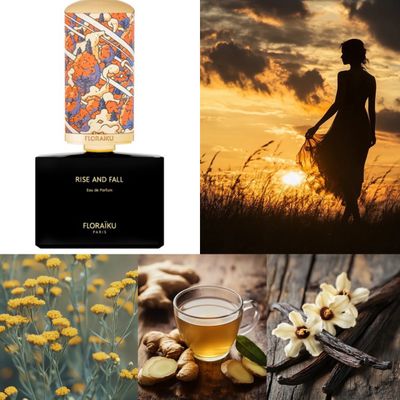 «Аромат Rise and Fall от Floraïku отражает прекрасный, но меланхоличный восход и заход солнца. Изящное превращение дня в ночь идеально передано с помощью аромата имбирного масла с Мадагаскара и абсолюта бессмертника, которые контрастируют с ванильными бобами и дополняют друг друга, создавая прекрасную пару, как темнота и свет», – цитата с сайта Harrods.