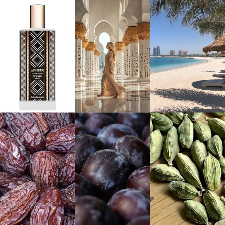 Memo описывают Abu Dhabi как аромат с «внутренним метрономом», который движется в ритме покачивающихся пальм в оазисе Аль-Айн. Визуальным вдохновением также послужила традиционная бедуинская ткань ручной работы саду. В аромате доминируют ноты финика — символа оазиса Аль-Айн — и сливы.