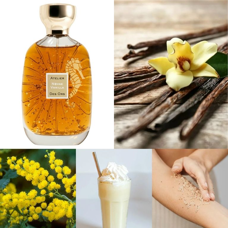Необычная ваниль с минеральной и звёздной свежестью, окутанная роскошным стручком ванили. Золотистое сияние мимозы, известной как золотой цветок, придаёт ей солнечную и лучезарную сладость. И трио редких ванили: элегантная и воздушная голубая ваниль NaturePrint®, плотская интенсивность бурбонской ванили и древесные, бархатистые грани мадагаскарской ванили.