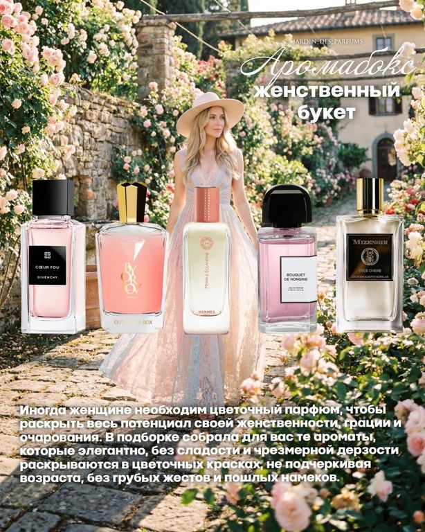 Добавить в избранное Убрать из избранного Аромабокс "Женственный букет" 1 710 ₽ Обьём Выберите параметр Обьём 1 мл 2 мл 3 мл 5 мл В корзину В корзину Описание Описание Аромабокс "Женственный букет" Givenchy Coeur Fou Orlov Paris Out Of The Box Hermes Hermessence Myrrhe Eglantine Parfums BDK Bouquet de Hongrie Mizensir Tres Chere